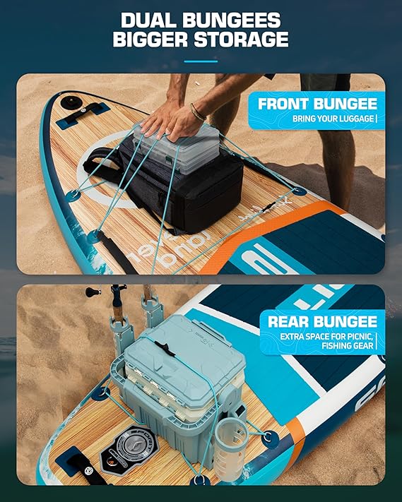 علاوه بر این، تخته پارویی بادی شامل چندین حلقه D برای نصب صندلی و سیم‌های بانجی 6 نقطه در جلو و 4 نقطه در عقب برای ذخیره ایمن وسایل و لوازم ضروری شما است. سیستم باله یکپارچه مانور و مسیربابی بهبود یافته را فراهم می کند و از یک پدل بردینگ روان و لذت بخش اطمینان می دهد.